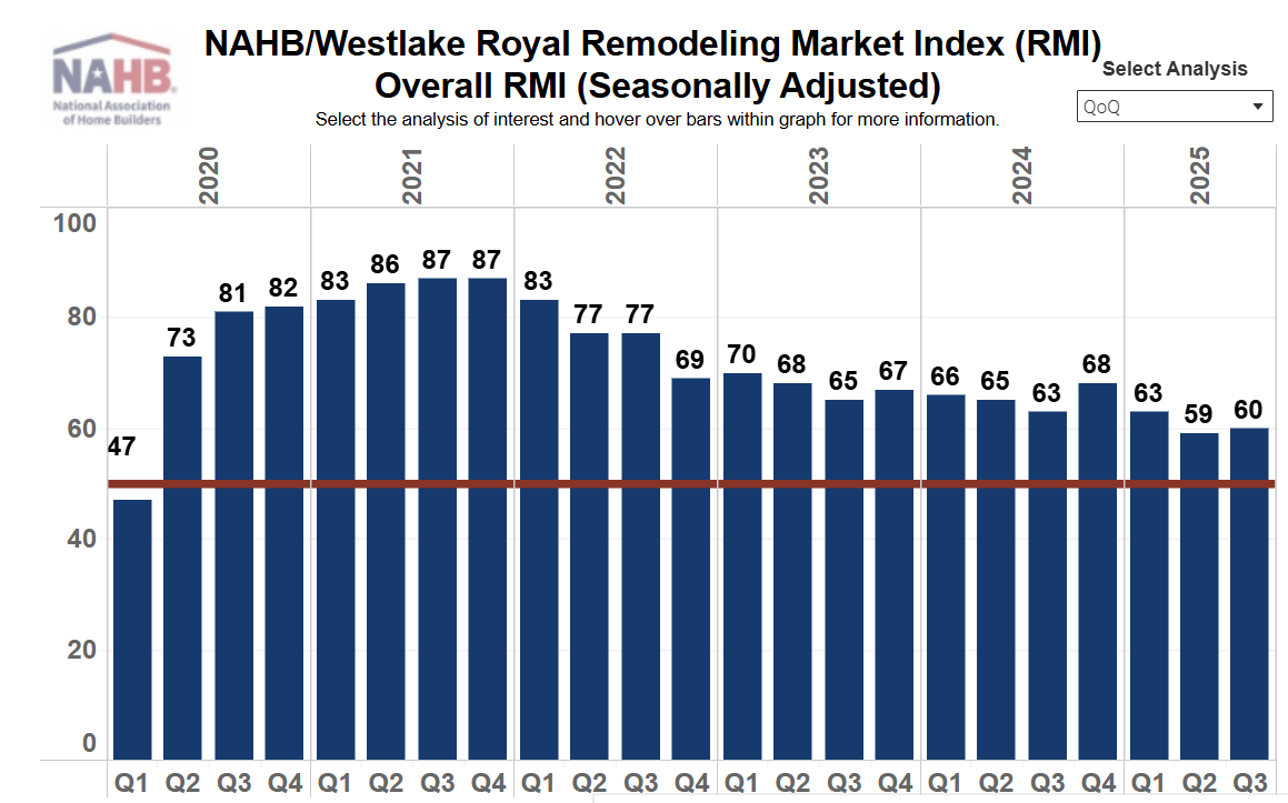 In the third quarter of 2025, the NAHB/Westlake Royal Remodeling Market Index (RMI) posted a reading of 60, up one point compared to the previous quarter. With the reading of 60, the RMI remains solidly in positive territory above 50, but lower than it had been at any time from 2021 through 2024.
